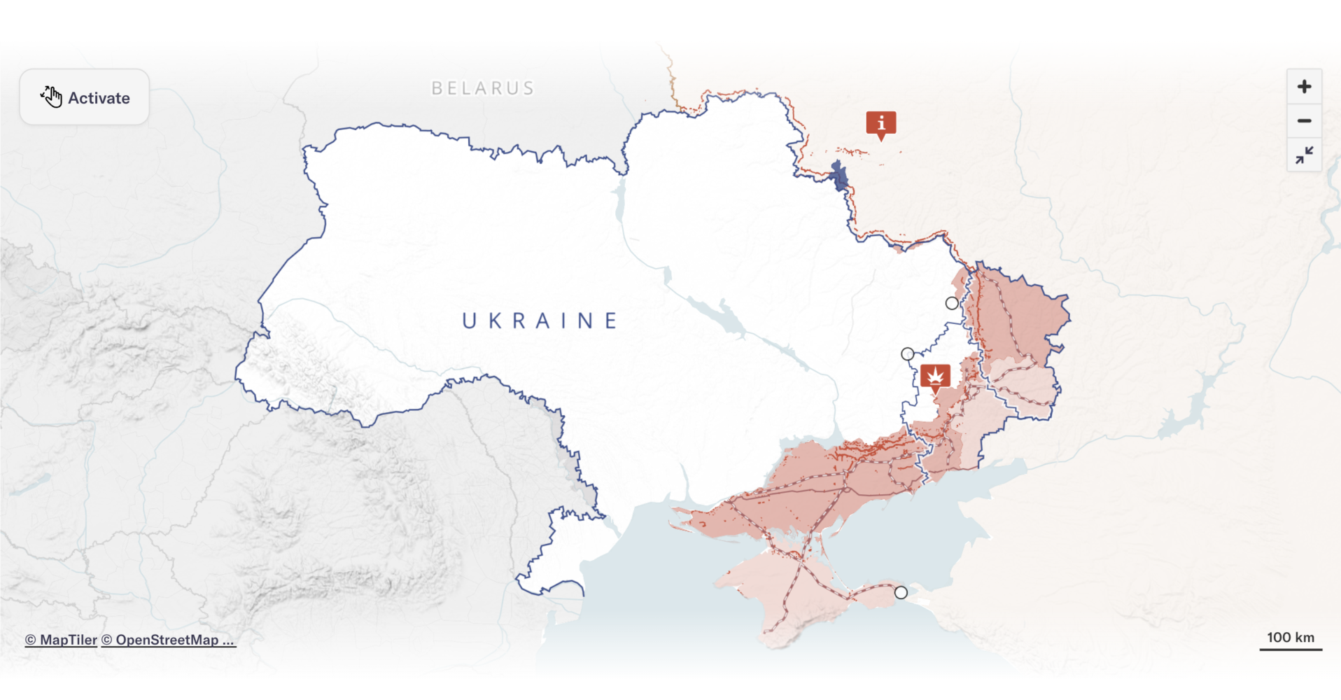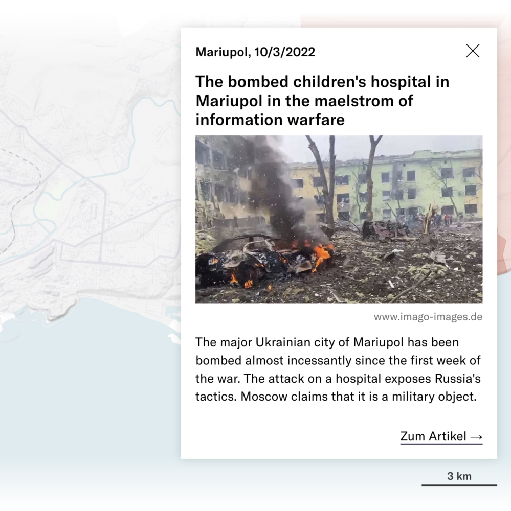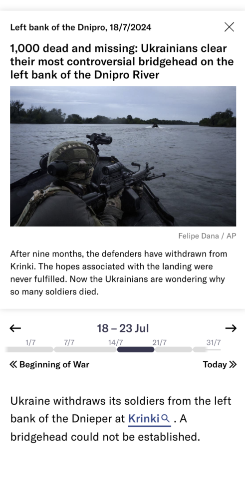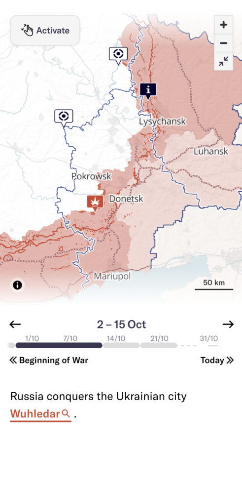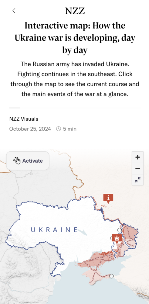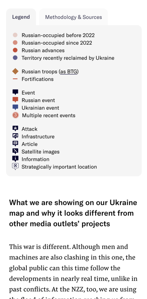 The Russian invasion of Ukraine was the first war to be tracked and analysed by millions over social media and public satellite imagery. To provide our readers with an up-to-date, visual overview of the situation, we launched an interactive map. It shows events that are important to the verlauf of the war, terretorial concessions, and troupe presence. Articles from NZZ-correspondets are also visible on the map. Readers can interact with the map by clicking on events for more information, pan and zooming, and by going thorugh the invasion day by day via the timeline. The map is updated daily with verified information. An extensive article below the map explains the methodology behind the data.